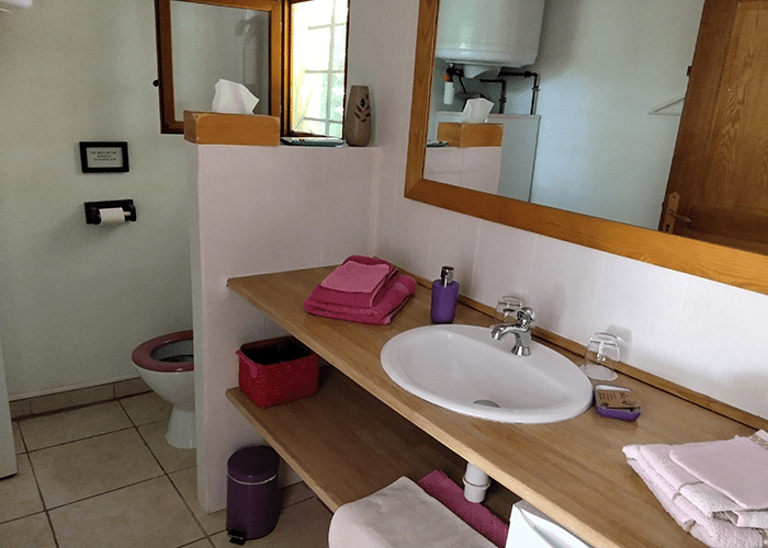 * Se situant au rez-de-chaussée, la chambre Orchidée, peut accueillir 2 personnes, plus 1 lit d’appoint, soit 3 personnes, avec salle de douche et toilettes, et une véranda privative,